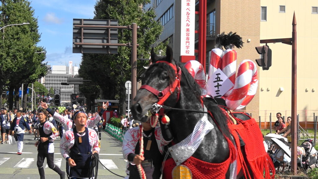 私は朝4時半に「藤崎八幡宮」の前で午前6時の出発を見届けて「日銀熊本支店」前に向かい「日銀」前での「馬追い」を撮影しました。国道3号線を背にして「正面」から「 SONY-FDR-AX60」と「ロアー2N」装着「FEELWORLD FW279S」モニターを「SONY リモコン三脚」につけ「リモコン」をフル活用「すべての馬追い」を撮影出来ました。この日は快晴で観客も多数でした。批判のあった馬に対する虐待はなかったようです。
